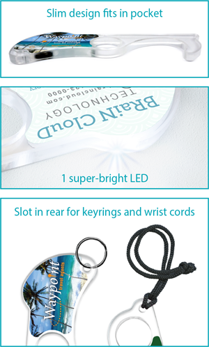 The acrylic key tool designed to reduce exposure to germs on doors and surfaces. Built-in light helps you see in low light. Full-color art on both front and back side of the tool.